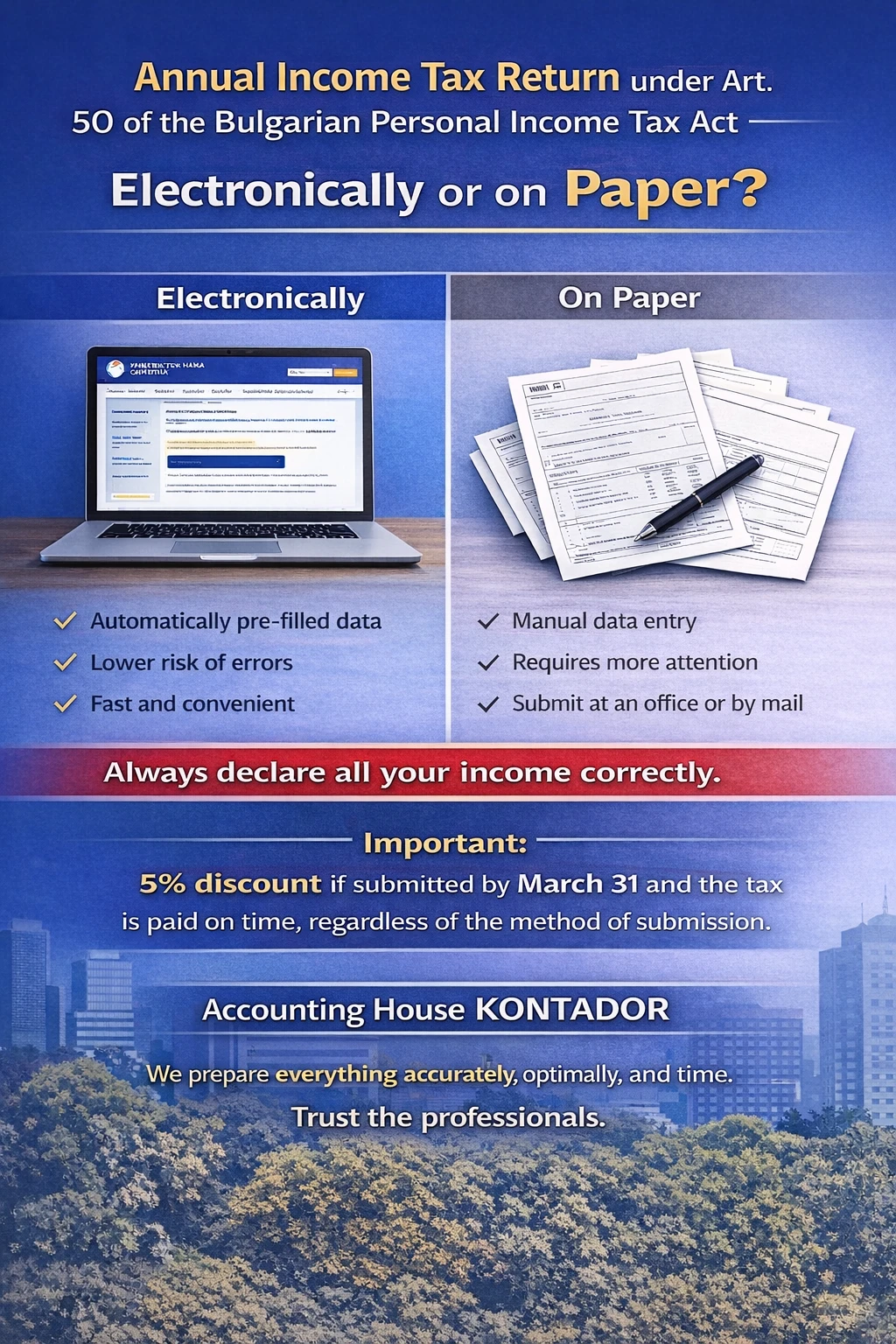 For additional services and professional assistance with the preparation and submission of the annual personal income tax return under Art. 50 of the Bulgarian Personal Income Tax Act, you can rely on the team of Accounting Firm KONTADOR. We will ensure that everything is prepared accurately, optimized, and submitted on time, helping you avoid errors and pay exactly what is due, without unnecessary risks.